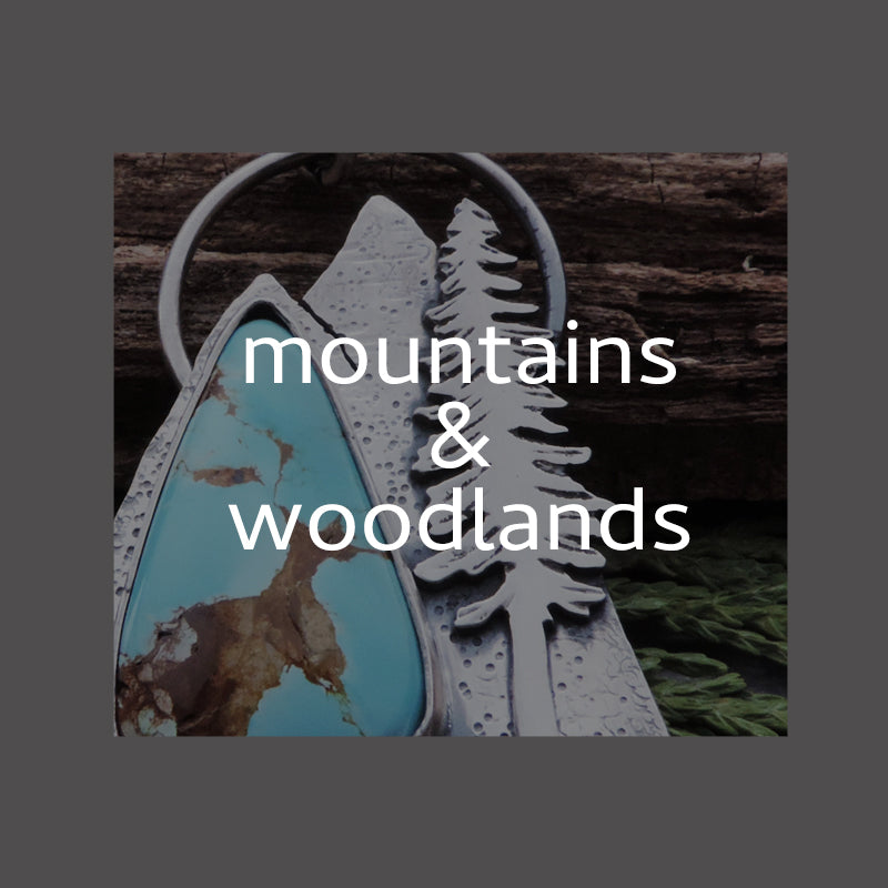 This whimsical pendant features layers of sterling silver pressed by a rolling mill to create a multi-textured patchwork mountain. Three little pine trees accent the landscape with a Sky Blue turquoise as a full moon.