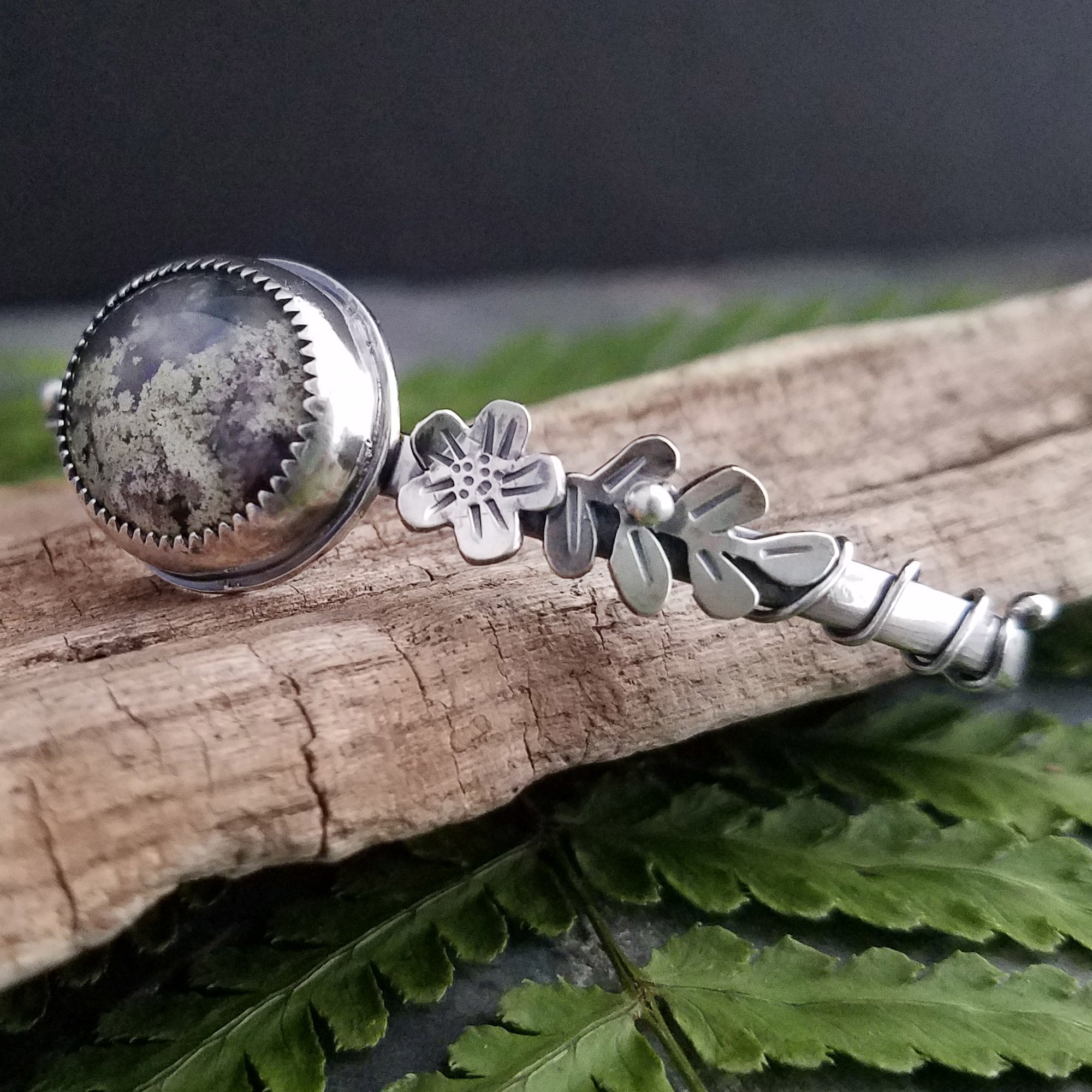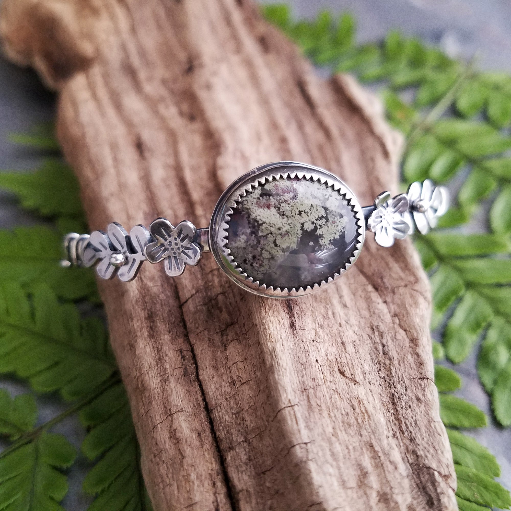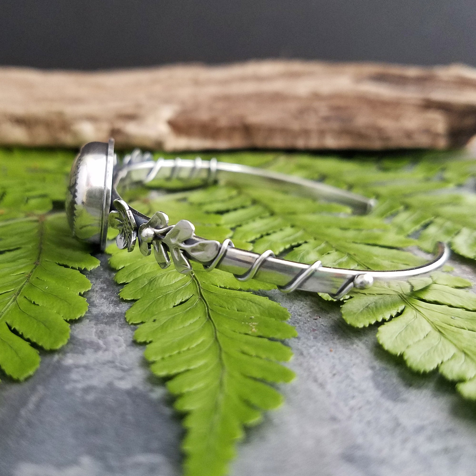 Simply sweet, this narrow sterling silver cuff bracelet features a small Indonesian Moss Agate set in a serrated bezel flanked on each side by petite hand-forged flowers and leaves. Wire tendrils wrap around the band for added interest.